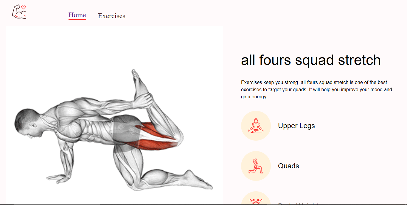This fitness project offers exercise tips, muscle-specific workouts, and their execution details. It retrieves exercise data from the Rapid API, categorizes it on the web, and enables users to search for exercises targeting specific muscle groups or equipment. The majority of functions are asynchronous due to data fetching from the external Rapid API. The project, developed with React.js, Material UI, and Rapid API, features scalable components for easy modification and reuse. It's accessible on GitHub but not deployed.
