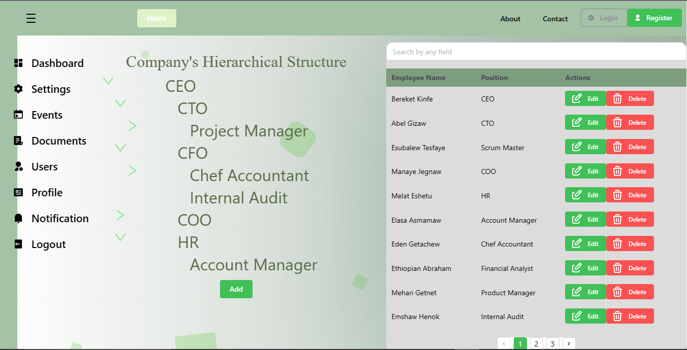 Is a web application for registering organization's employee hierarchy or structure. That creates employee position/role, the position added is hierarchical meaning there is a parent child relationship between the positions e.g. CEO can be root position no parent and CFO is a child of CEO. The system allows employees or positions to be updated/deleted.
